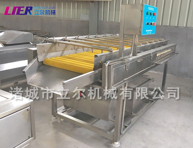 當(dāng)原料放入該機(jī)后,毛刷輥旋轉(zhuǎn)刷洗原料并使其不斷翻轉(zhuǎn),同時(shí),排水管不斷地噴淋,把從原料上刷洗下來的污物沖洗掉,直到洗凈為止,順著毛輥的旋轉(zhuǎn)方向出料。
