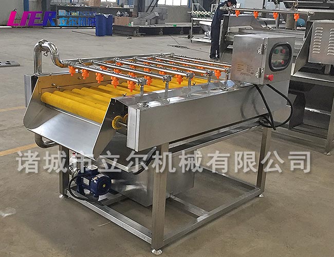 設(shè)備是由多根毛輥按照一條直線排列的,當(dāng)毛輥在電機的同步帶動下沿著出料口方向做自轉(zhuǎn)運動,利用毛輥上毛刷的摩擦力與本身的向心力作用下,物料沿著入料口位置向出料口位置運動;運動過程中毛刷與物料表面接觸,去除了物料表面纏繞的毛發(fā)及其他雜質(zhì),在循環(huán)水泵的作用下,水沿著噴淋管道進(jìn)入噴頭,對物料本身進(jìn)行沖洗,用介質(zhì)水沖洗物料可減輕物料與毛刷之間的摩擦,防止破損,同時把物料清洗的雜質(zhì)及時的沖離。